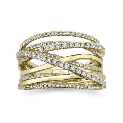 14K Yellow Gold 0.62cttw Diamond Crossover Bridge Fashion Ring. This fun style ring features 0.62cttw of round pave diamonds. Finger Size 7.