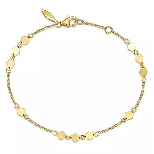 14K Yellow Gold 7 inch Rhombus Stations Bracelet with lobster claw clasp. This stylish bracelet design features high polished yellow gold rhombus stations. Bracelet is 14K yellow gold and measures 7 inches in length. Designed by Gabriel & Co.