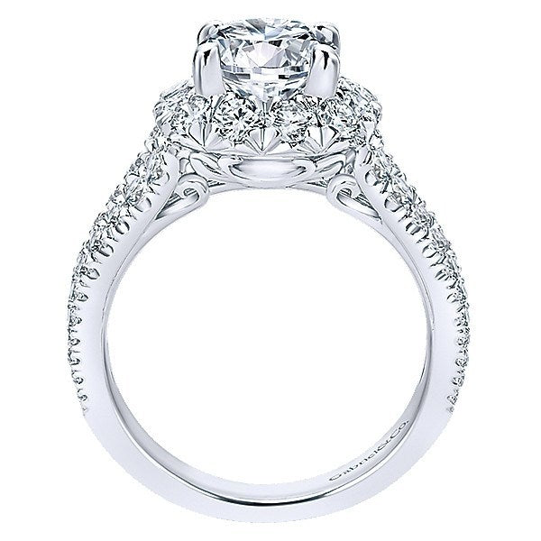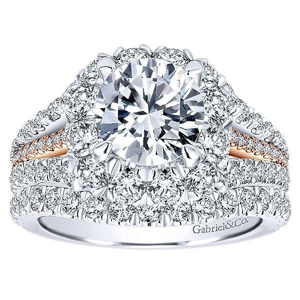 14K White & Rose Gold 1.33cttw Triple Shank Style Halo Diamond Engagement Ring. This ring features 1.33cttw of round diamonds with a triple shank of diamonds featuring central rose gold band. This mounting is designed to feature a large 1.5ct round center diamond surrounded by a cushion shaped diamond halo. All diamonds are F/G in color and SI in clarity. Designed by Gabriel & Co. #316A