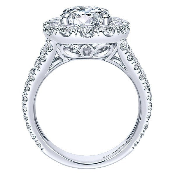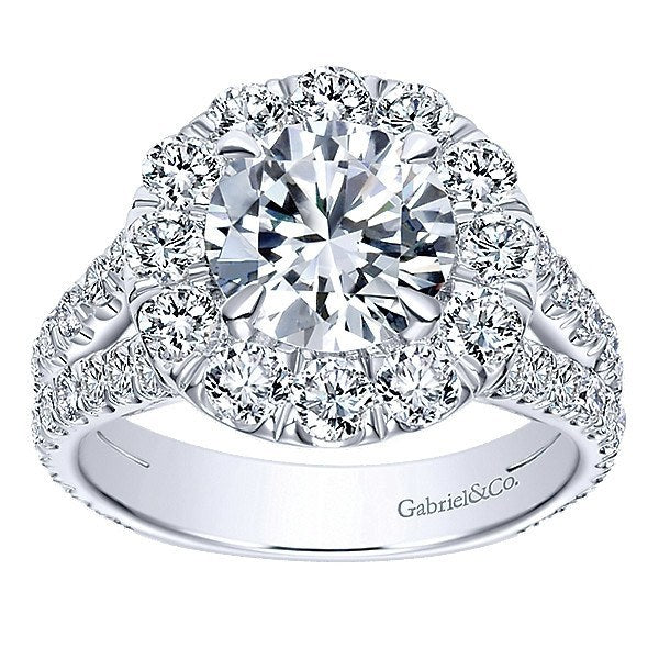 14K White Gold 1.86cttw Split Shank Halo Diamond Engagement Ring. This ring features 1.86cttw of round diamonds with a substantial split shank of pave set round diamonds. Features a stunningly large round halo design created to accent a 2ct round center diamond. All diamonds are F/G in color and SI in clarity. Designed by Gabriel & Co. #324A