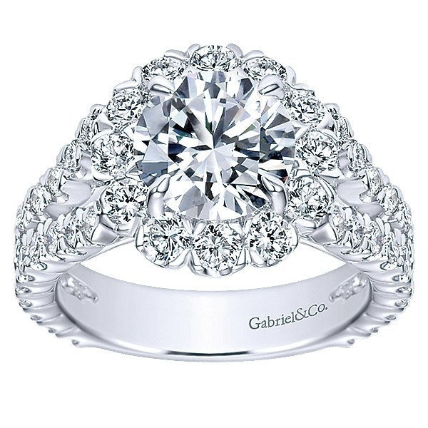 14K White Gold 1.92cttw Split Shank Floral Halo Diamond Engagement Ring. This ring features 1.92cttw of round diamonds with a substantial split shank of pave set round diamonds. Features a large round floral halo design to accent a 2ct round center diamond. All diamonds are F/G in color and SI in clarity. Designed by Gabriel & Co. #328A