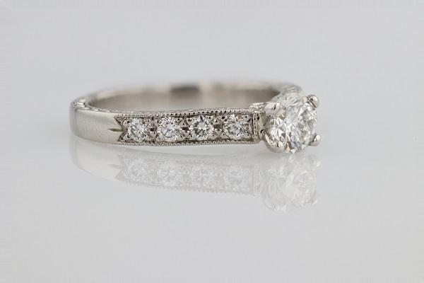 Platinum 1.51cttw with .55ct G/SI2 Engagement Ring & Wedding Band with GSI Cert Wedding Set featuring a .55ct H/SI2 Round Brilliant Center Diamond measuring 5.20x5.23x3.18mm with GSI Cert #7335800101. Platinum engagement ring and wedding band both feature .46cttw of G/VS quality accent diamonds.