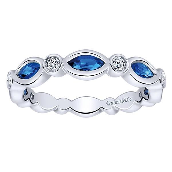 14K White Gold Diamond and Marquise Sapphire Stackable Ring. Perfect for stacking, this bezel set diamond and sapphire ring has repeating round bezel set diamond and marquise shaped blue sapphire stations. Diamonds weight a total of .13cttw and blue sapphires total .86cttw. Contains 5 marquise blue sapphire and 6 round diamonds, this band is not an eternity band for easy ring sizing down the road. This ring is 14K white gold and diamonds are I/J color and eye-clean SI3 clarity. Designed by Gabriel & Co., also available in yellow gold and rose gold.