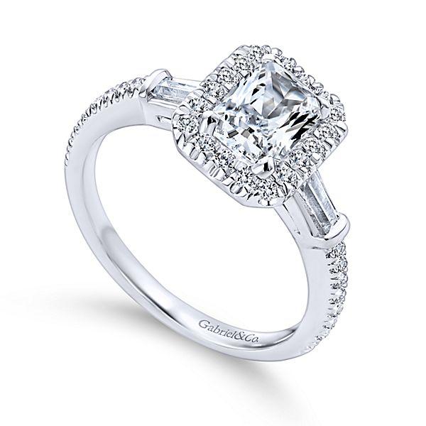 14K White Gold .58cttw Emerald Cut Halo Diamond Engagement Ring with Baguette Accents. A modern twist on the classic emerald cut and baguette 3-stone, this mounting features .58cttw of round diamonds prong set down the shank and surrounding the center diamond. The star of the show is designed to be a 1.25ct emerald cut center diamond set in a secure 4-prong head, accented by two tapered baguettes. All accent diamonds are F/G in color and SI in clarity. Designed by Gabriel & Co. #381A