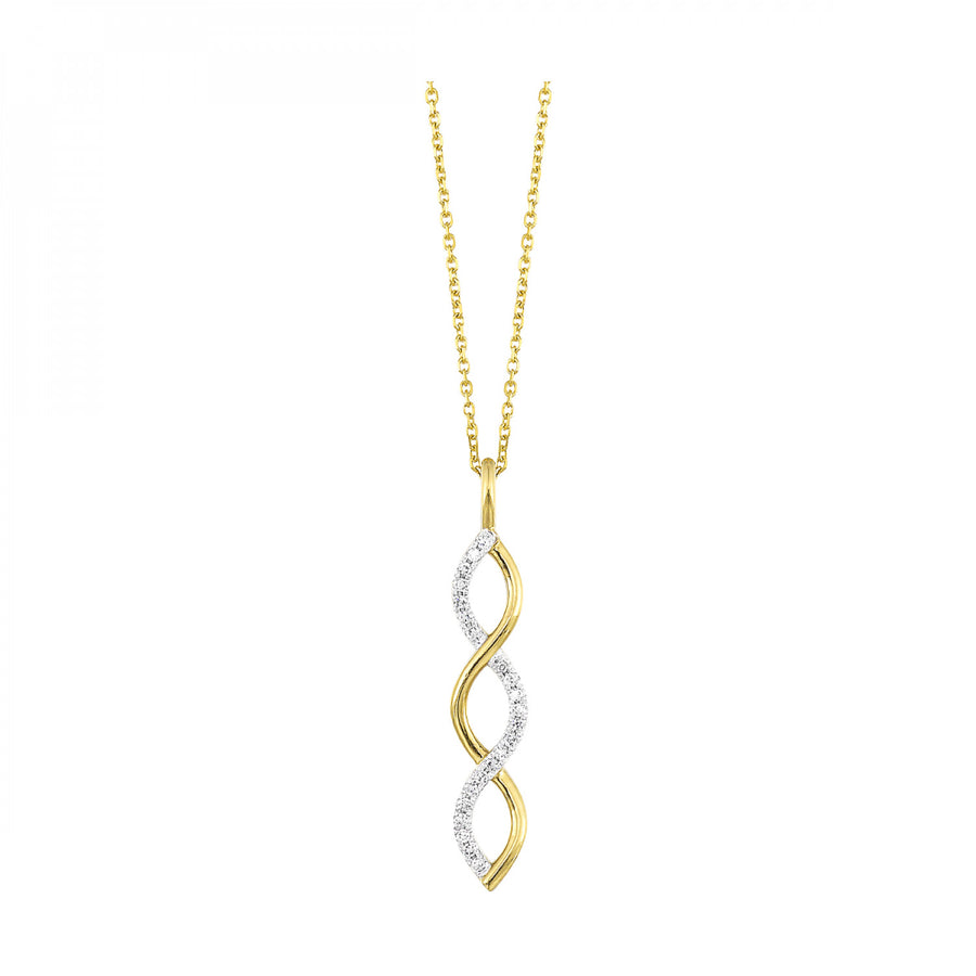 10K Yellow Gold 1/12cttw Diamond Drop Crossover Pendant on an 18 inch chain with lobster claw clasp. This diamond pendant features 1/12cttw of round diamonds set into polished 10K yellow gold. Comes with a 10K yellow gold 18 inch chain.