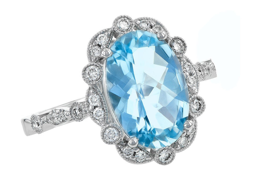 14K White Gold Vintage Aquamarine Halo Diamond Ring