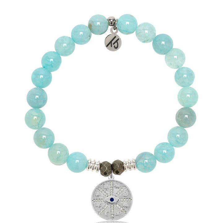 Aqua Fire Agate Gemstone Bracelet with Protection Sterling Silver Charm