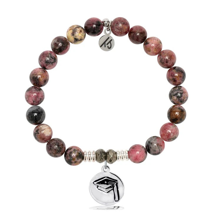 Pink Rhodonite Stone Bracelet with Grad Cap Sterling Silver Charm