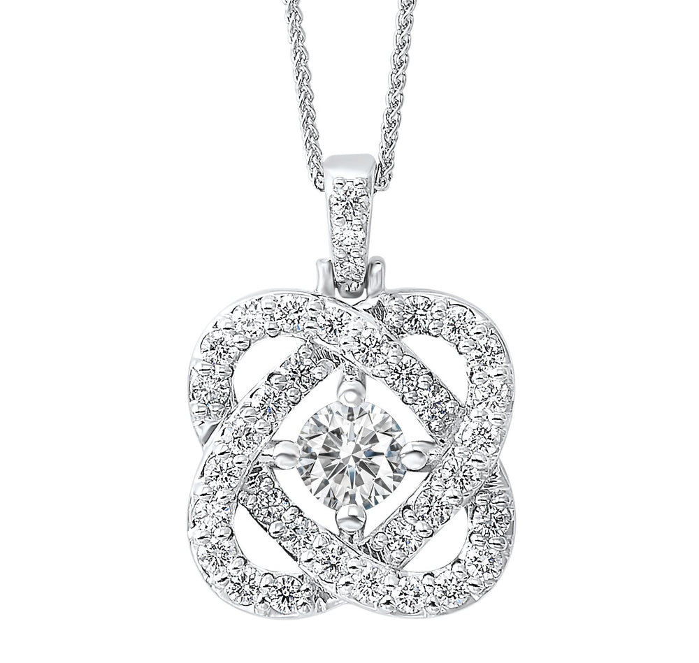 14K Two-Tone Yellow And White Gold Love's Crossing 1/7cttw Diamond Drop Necklace. This popular designer necklace features .15cttw of G/SI quality diamonds, pave set in a double loop design. Comes with a 14k white gold 18 inch cable chain with lobster claw clasp.