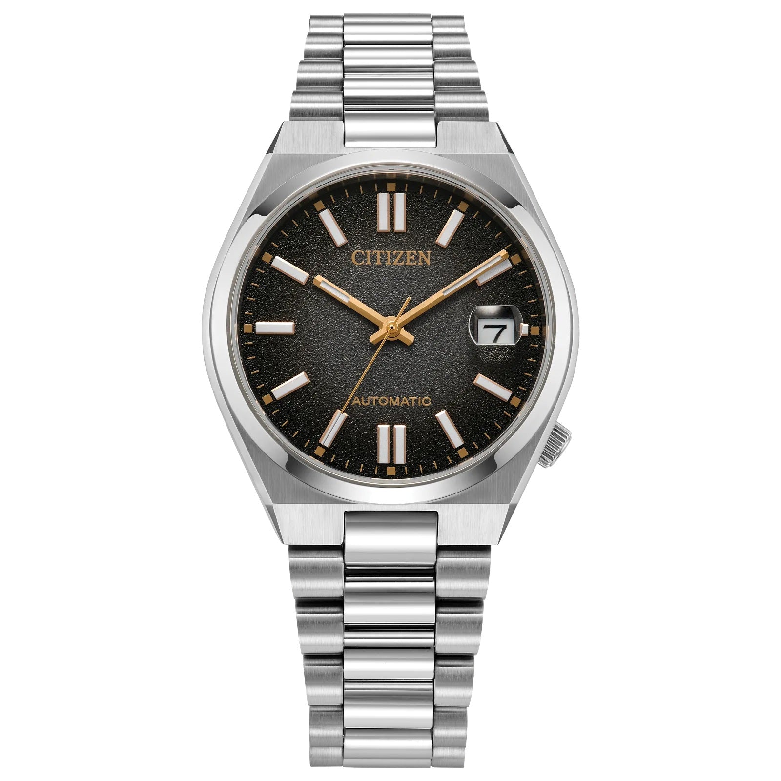 Citizen Automatic Men's TSUYOSA 37mm “Time Slip” Watch. Executed in a versatile 47mm footprint, the sophisticated design of the watch makes a strong impression via a silver-tone stainless steel case and a seamlessly integrated, matching bracelet. Underneath an anti-reflective sapphire crystal, the sporty timepiece makes use of a black dial, with a 3 hand date window and contrasting silver-tone details adding to its classic aesthetic. Powered by an automatic movement and offering up to 50 meters of water resistance, the refined timepiece is a daily wearing choice ready for work, play, and everything in between. Caliber 8210.