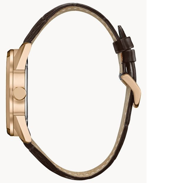 Citizen Classic Mens Eco-drive watch with brown embossed leather strap with buckle closure. Silver face Featuring a rose gold-tone stainless steel case and ivory dial with day and date indicator Featuring our Eco-Drive technology – powered by light, any light. Never needs a battery.