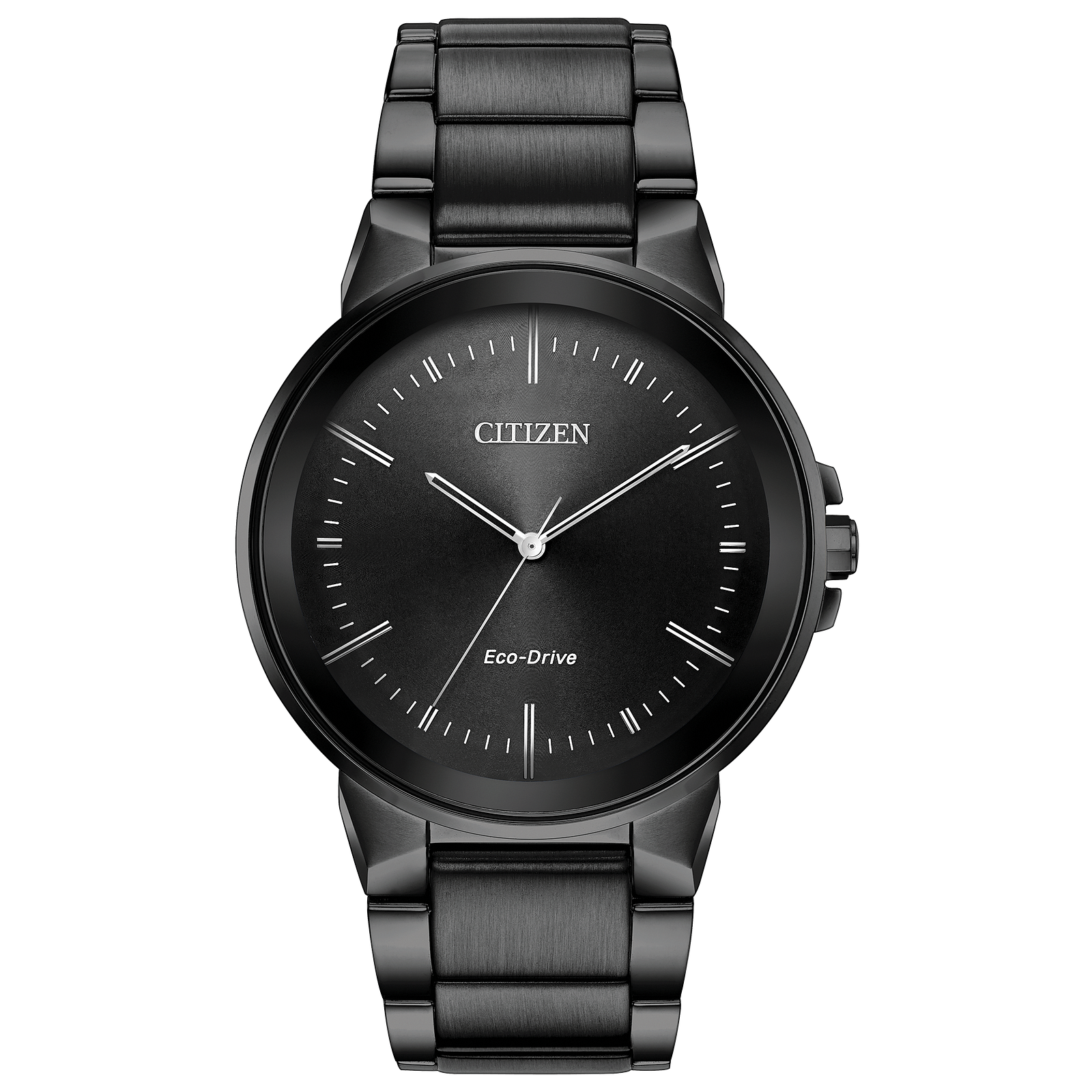 Citizen Eco-Drive Men's Axion Watch. This Eco-Drive watch is powered by light, and featuring a men's grey stainless steel case and bracelet with a black dial and the intriguing feature of edge-to-edge glass and mineral crystal.