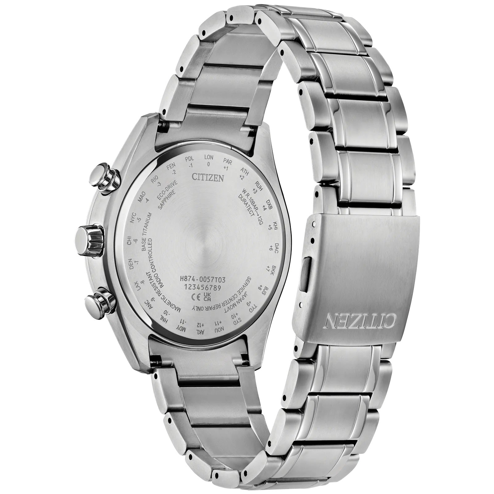 Citizen Eco-Drive Men's Tsuki-yomi A-T Watch. This Eco-Drive watch is powered by light, and features a 43mm in a silver-tone Super Titanium case with a purple dial. Features day/date, moonphase, World Time in 24 Time Zones, Radio Control, Perpetual Calendar, Atomic Timekeeping and sapphire crystal.