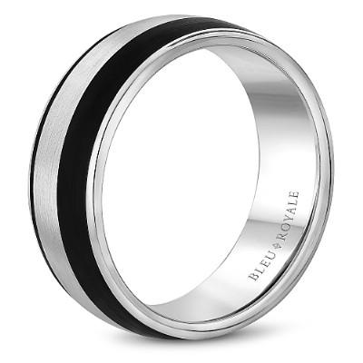 This Bleu Royale designer Men's wedding ring features a two-tone design of 14K white gold with a brushed sandpaper finish measuring 8.5mm wide. Features two jet black carbon accent inlays for a sleek, sophisticated look. Accented by a high polished 14K white gold edges and interior. Finger Size 10.