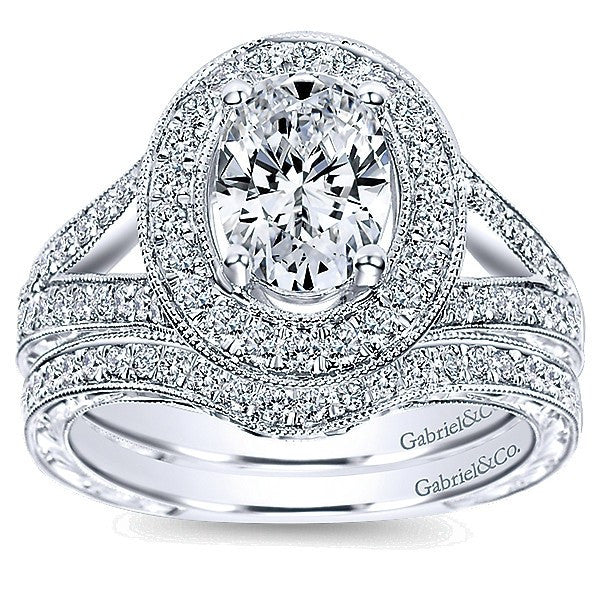 14K white gold .54cttw classic oval halo split shank diamond engagement ring. This 1/2cttw mounting features bead set round side diamonds with G color and SI clarity, set in a split shank and oval halo design, complimenting a 1ct oval center diamond (measuring approximately 8x6mm). Designed by Gabriel & Co. #217A.