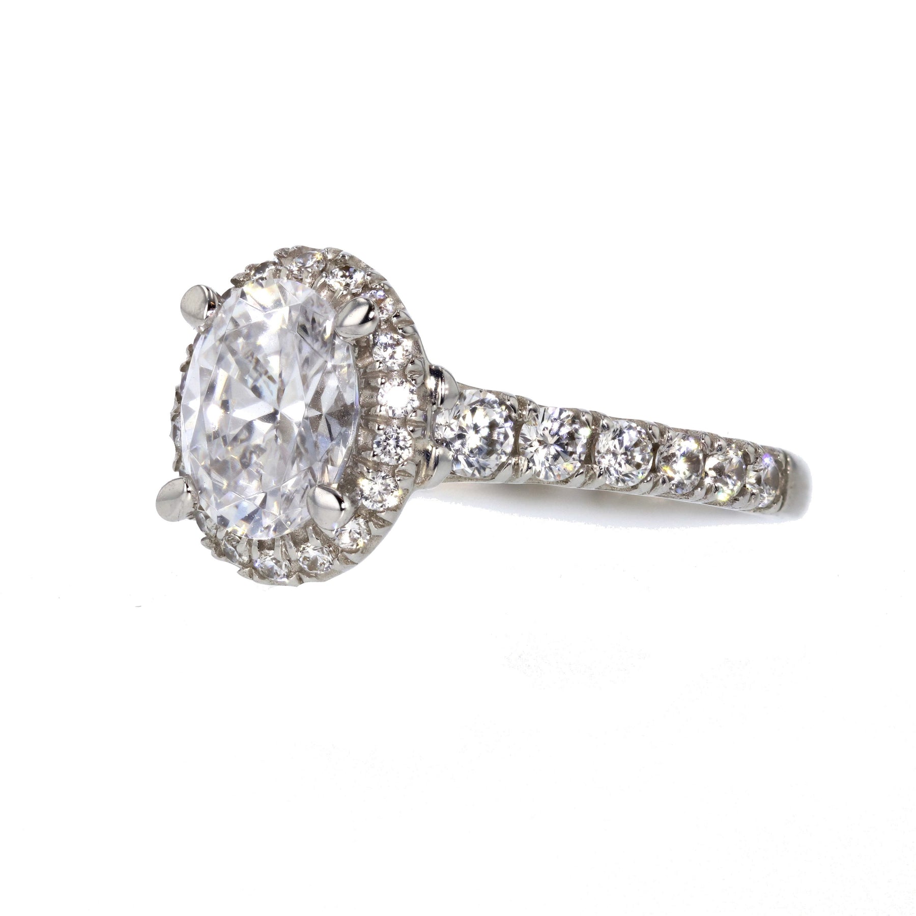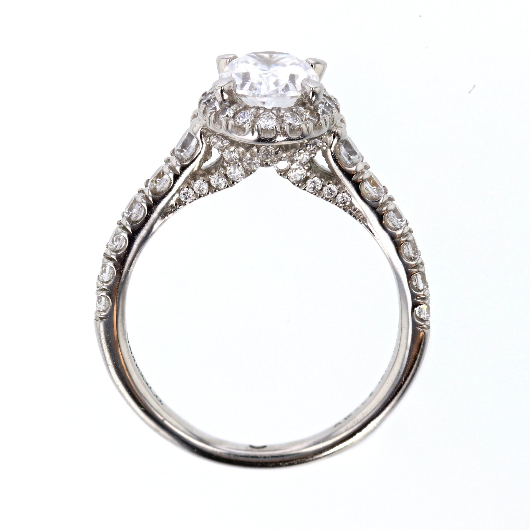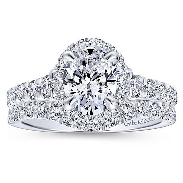 14K White Gold .76cttw Oval Halo Diamond Engagement Ring with Tapered Diamond Sides. This modern classic engagement ring style features .76cttw of round diamonds prong set down a tapered shank in an oval halo design. This halo mounting is designed to perfectly fit a 1ct oval center diamond set in a 4-prong head. All accent diamonds are F/G in color and SI in clarity. Designed by Gabriel & Co. #372A