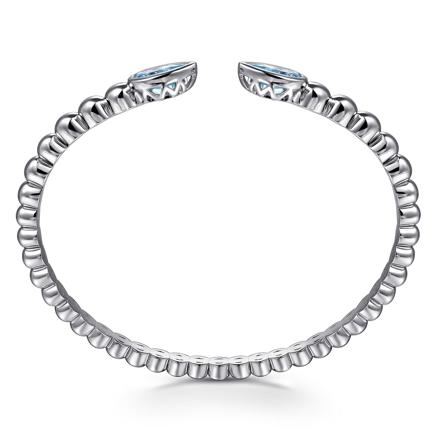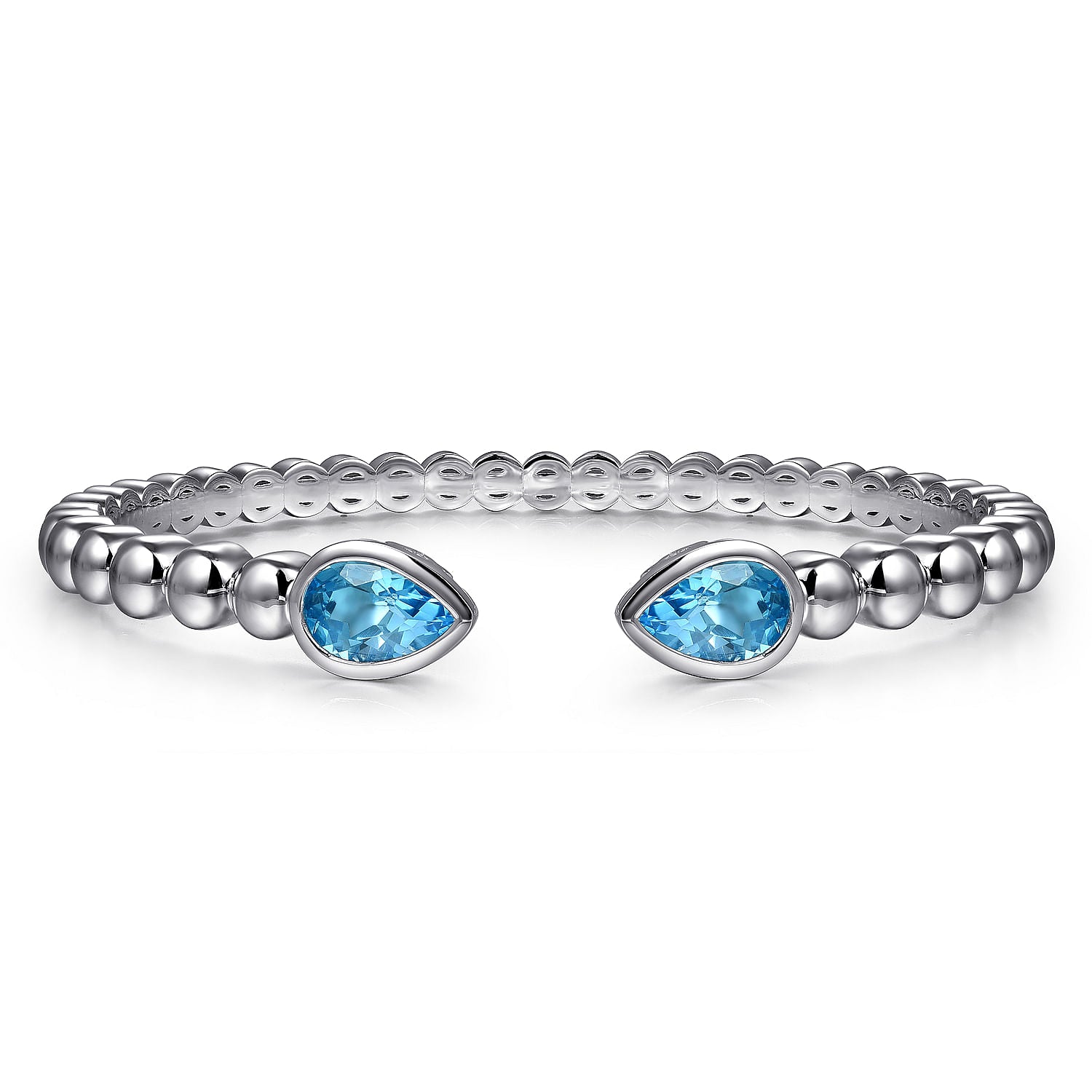 6.25" Sterling Silver Bujukan & Pear Shape Blue Topaz Split Bangle Bracelet. This sterling silver bangle style bracelet is 6.25 inches and features two pear shaped garnets bezel set. Designed by Gabriel & Co.