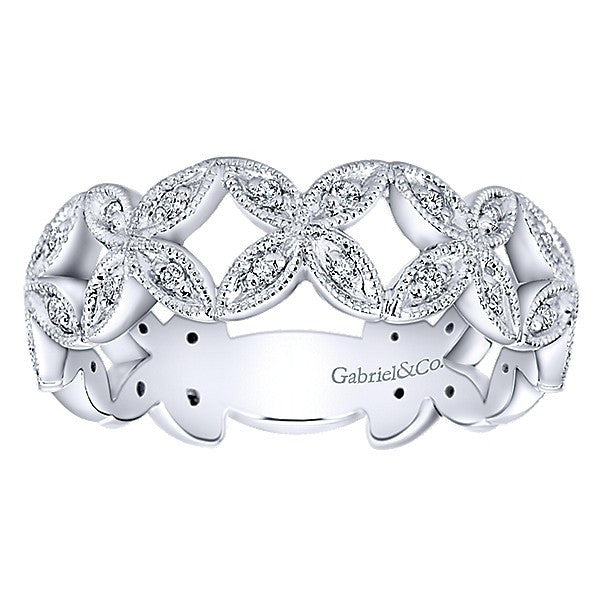 14K White Gold Diamond Stackable Ring with Floral Design. This classic 6mm wide stackable band features a floral design with a bottom polished section for easy sizing. Features .15cttw of bead set round diamonds with I color and SI clarity. Designed by Gabriel & Co.