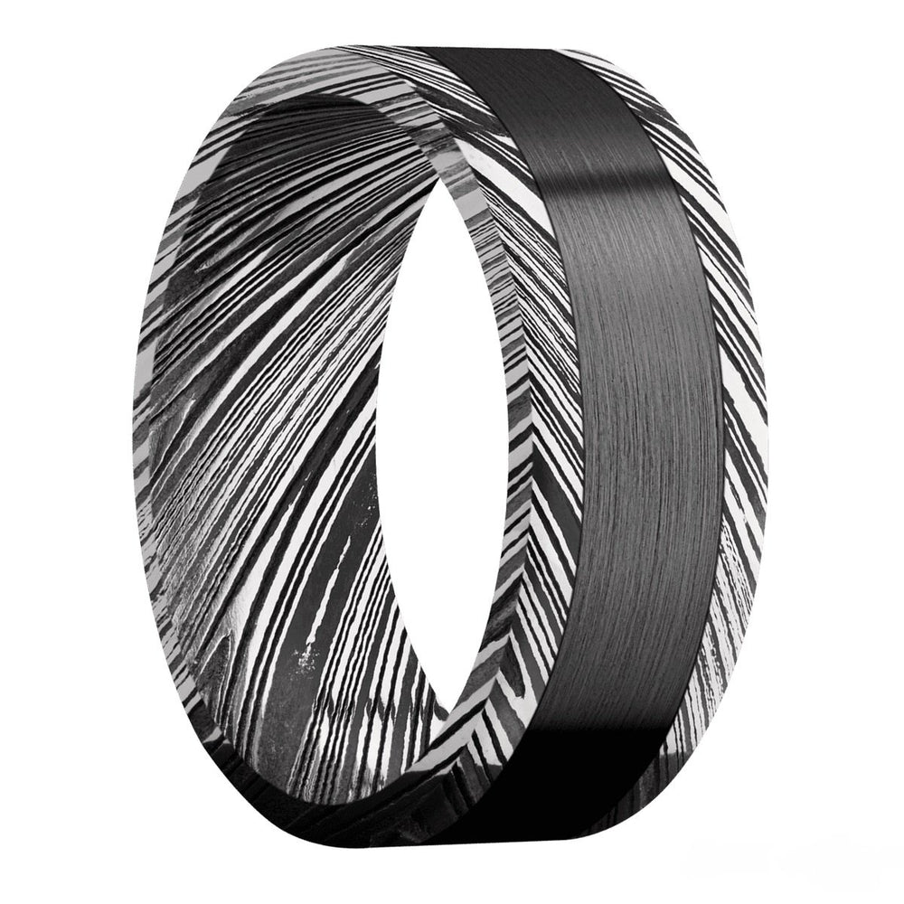 Woodgrain Damascus Steel 8mm Wedding Band with Acid Finish and Black Zirconium Inlay