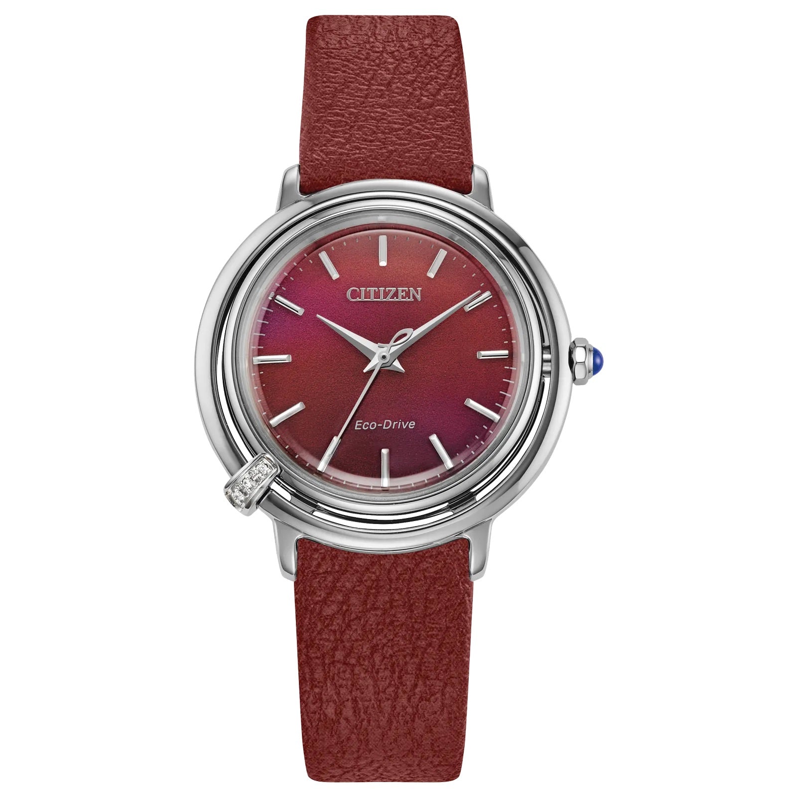 Citizen Eco-Drive Women's Citizen L Arcly Interchangeable Strap Set Silver-tone & Deep Red Apple Strap Watch. This Eco-Drive watch is powered by light, and features a 31.2mm silver-tone stainless steel case with small diamond accent. Deep Red dial, 3-hands with spherical sapphire crystal.