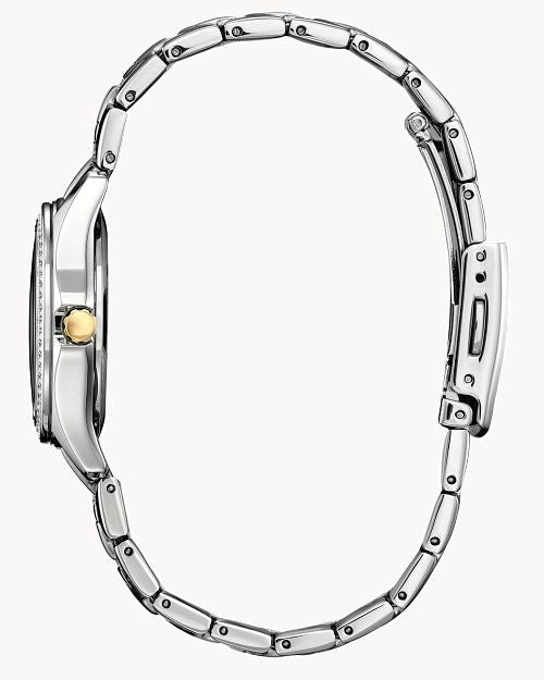 Citizen Eco-Drive Women's Elegant Crystal Collection Watch. This Eco-Drive watch is powered by light, and features a 30mm two-tone stainless steel case and bracelet with silver tone dial. Has 3-hands and date with mineral crystal. This elegant timepiece shines bright with 70 crystals surrounding the two-tone stainless steel case and white 3-hand dial and has a silver- and gold-tone stainless steel bracelet fastened with a fold over clasp.