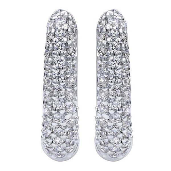 1/4cttw Diamond Huggie Earrings in 14K White Gold. The classic petite diamond huggie earrings have .26cttw of pave set round diamonds. Diamonds are I/J color and eye-clean SI3 clarity. Designed by Gabriel & Co., also available in yellow gold.