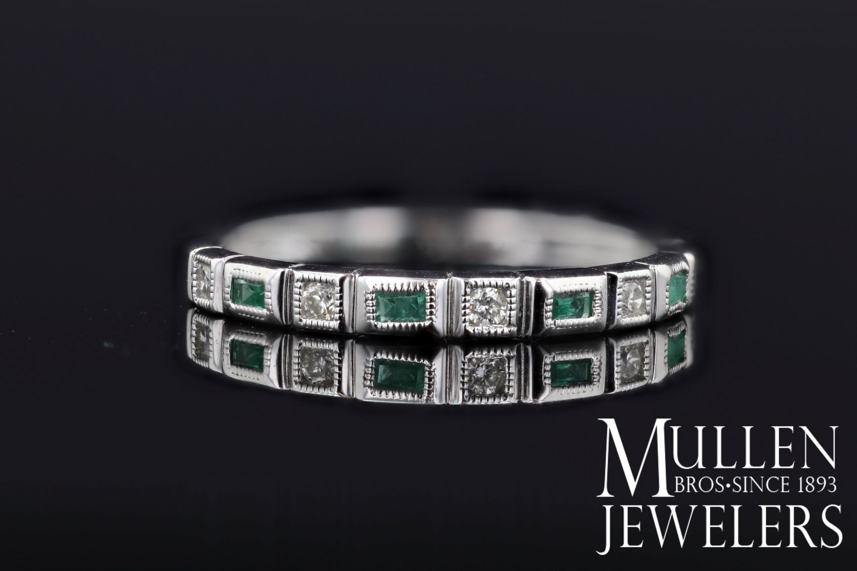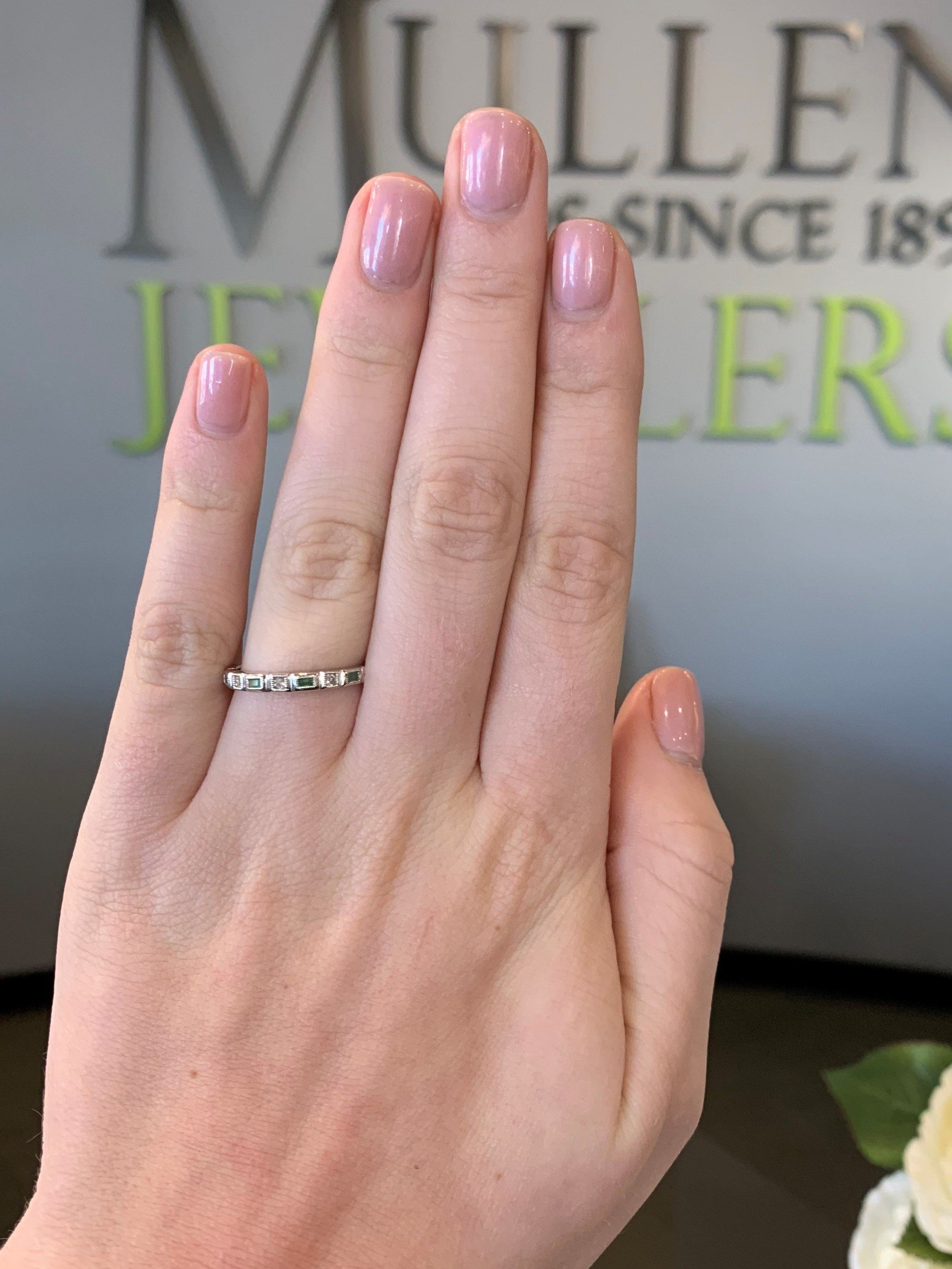 10k white gold diamond and emerald cut emerald birthstone ring. The perfect May birthstone ring or mothers ring, this 10 karat white gold band has emerald cut emeralds and diamonds alternating half way around the ring. All birthstone rings and mother's rings are available in all birthstones, although the April (diamond) version may cost more. Looks great worn alone, or as a stackable ring.