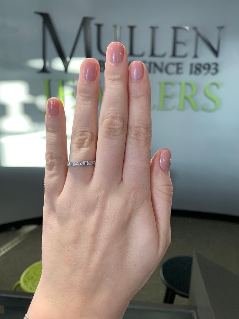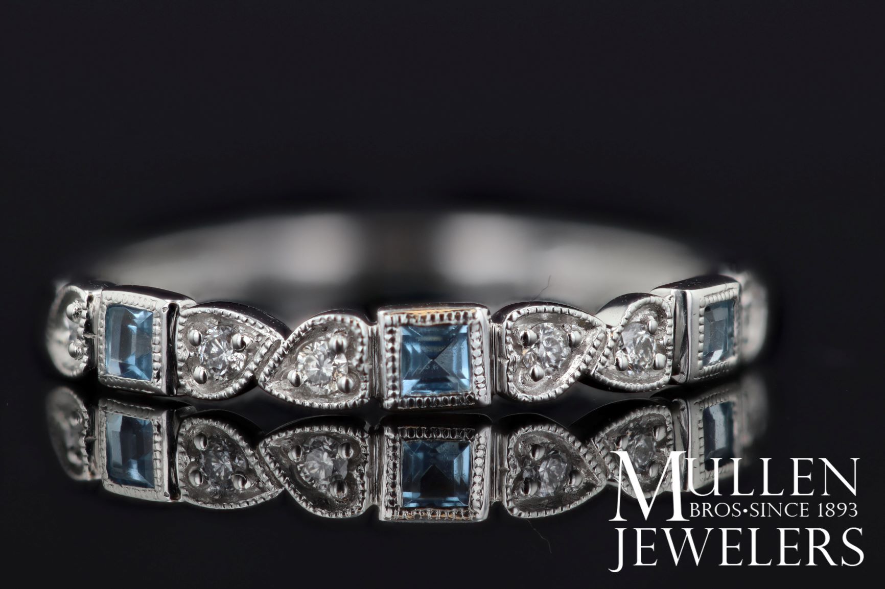 10k white gold diamond and square aquamarine birthstone ring. The perfect March birthstone ring or mothers ring, this 10 karat white gold band has square aquamarines and diamonds alternating half way around the ring. All birthstone rings and mother's rings are available in all birthstones, although the April (diamond) version may cost more. Looks great worn alone, or as a stackable ring.