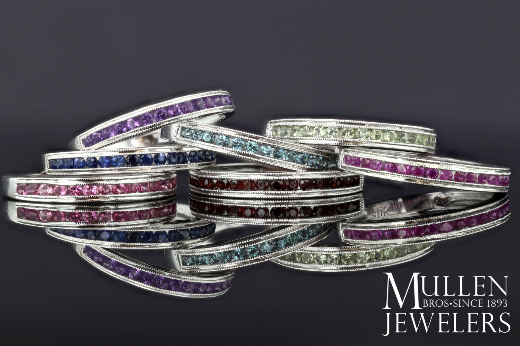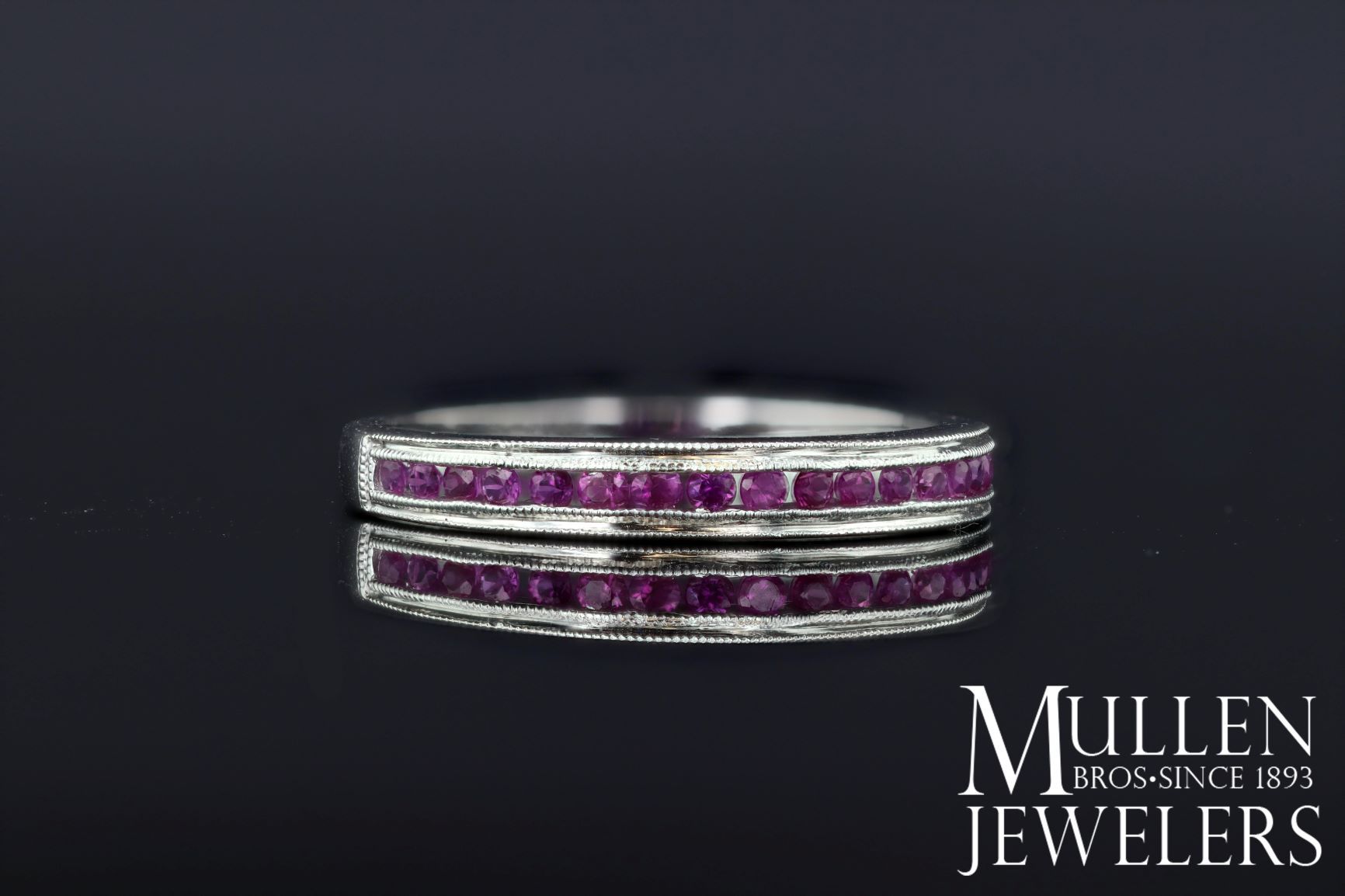 10k white gold ruby channel set birthstone ring. The perfect July birthstone ring or mothers ring, this 10 karat white gold band has channel set round rubies going half way around the ring. All birthstone rings and mother's rings are available in all birthstones, although the April (diamond) version may cost more. Looks great worn alone, or as a stackable ring.
