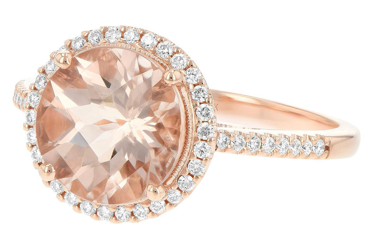 14K Rose Gold Morganite and Diamond Halo Ring. This classic halo ring features a stunning 2.10ct round morganite, accented by a pave set diamond halo. The diamonds total .20cttw and are G in color and SI in clarity. Designed by Allison Kaufman.