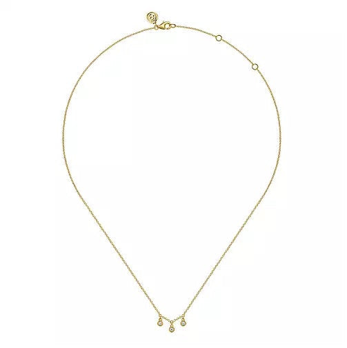 14K White Gold .09cttw 3 Stone Bezel Set Diamond Drop Pendant. Comes with 17.5 inch 14k yellow gold chain with lobster claw clasp. This necklace is 14K yellow gold and diamonds are I/J color and eye-clean SI3 clarity. Designed by Gabriel & Co