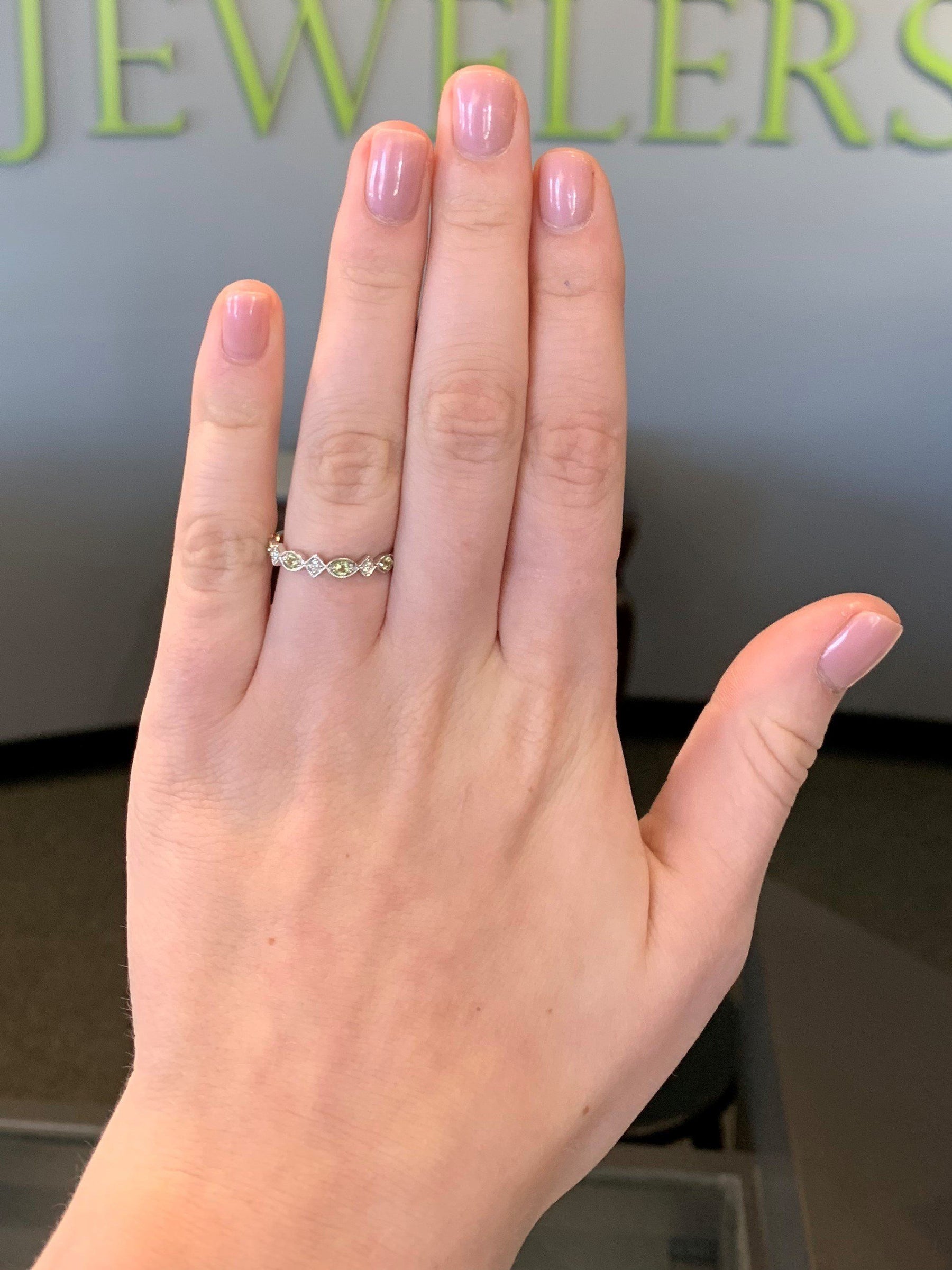 14k white gold diamond and peridot birthstone ring. The perfect August birthstone ring or mothers ring, this 14 karat white gold band has round peridot and diamonds alternating half way around the ring. All birthstone rings and mother's rings are available in all birthstones, although the April (diamond) version may cost more. Looks great worn alone, or as a stackable ring.