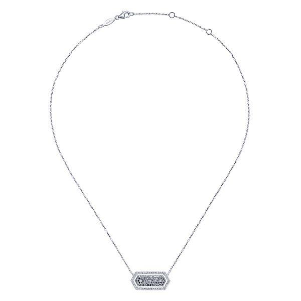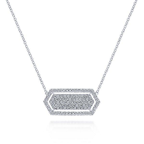 14K White Gold Long Hexagonal Cluster Diamond Halo Bar Necklace. This fun diamond fashion necklace contains .91cttw of round diamonds in a long horizontal hexagon design with a pave cluster of round diamonds and diamond halo. Comes with a 14k white gold 18 inch chain. This necklace is 14K white gold and diamonds are I/J color and eye-clean SI3 clarity. Designed by Gabriel & Co., also available in yellow gold and rose gold.