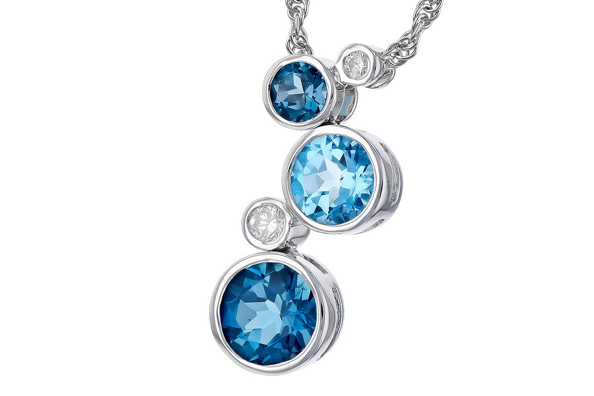 14K White Gold Swiss & London Blue Topaz and Diamond Bezel Set Bubble Necklace. This fun fashion necklace features a mixture of 2.30cttw of round blue topaz and .10cttw diamonds set in solid 14K white gold full bezels. Comes attached to a 14K white gold 18 inch cable chain with lobster claw clasp.