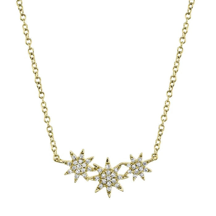 14K Yellow Gold 0.09cttw Diamond Star Necklace. This classic star diamond pendant features 0.09cttw of round diamonds. Comes attached to an 18 inch 14K yellow gold chain with lobster claw clasp.