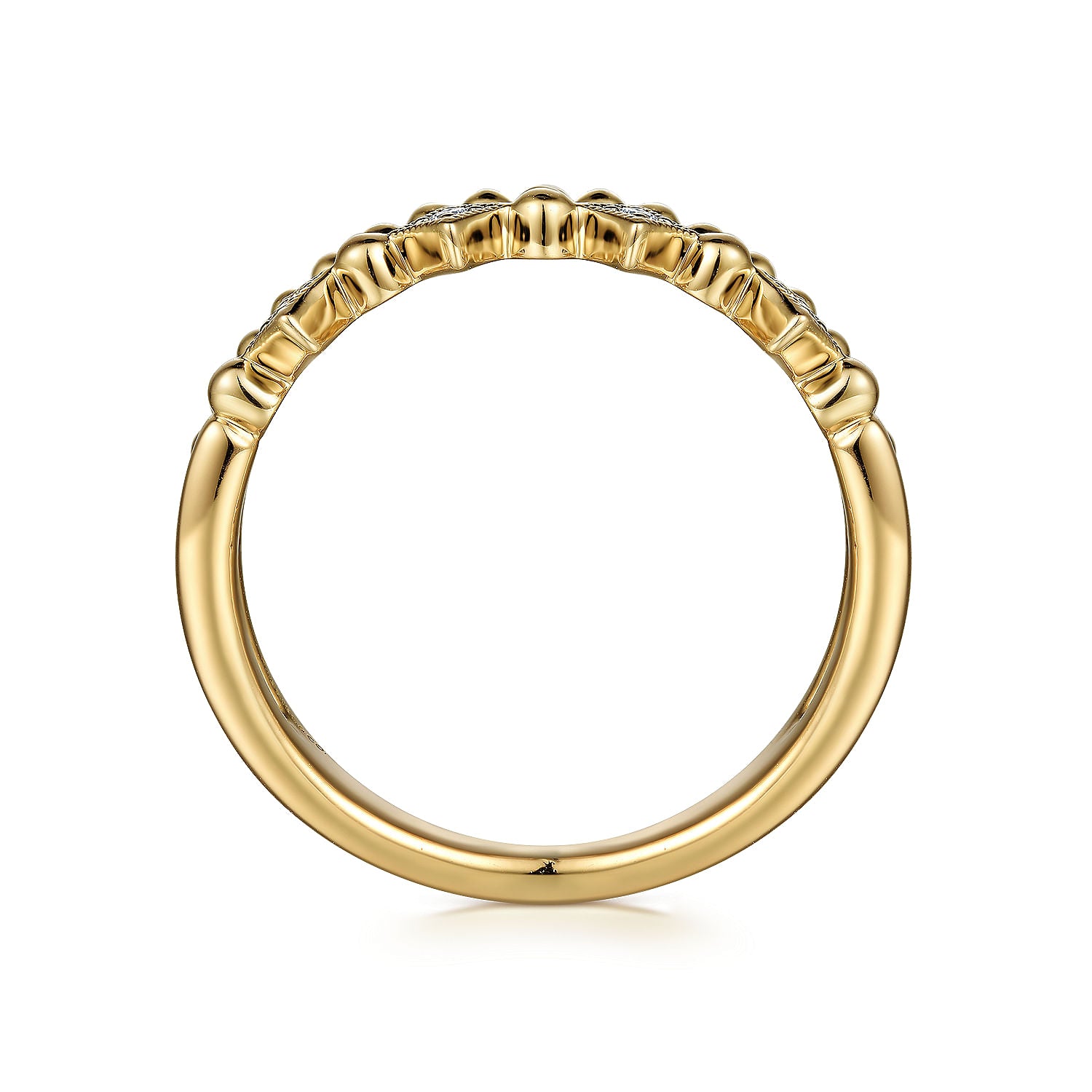 14K Yellow Gold .04cttw Bujukan Diamond Easy Stackable Ring. This fun stackable band features double bands with polished bujukan bead sections and .04cttw of bead set round diamonds with I color and SI clarity. Designed by Gabriel & Co.