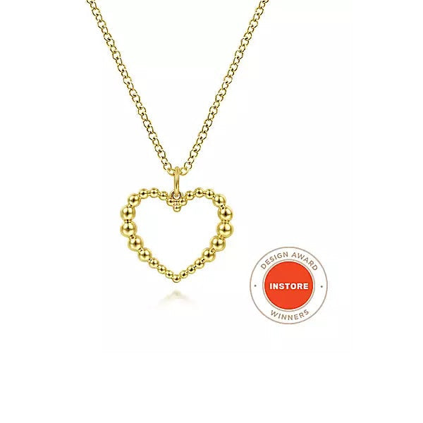 14K Yellow Gold Bujukan Beaded Open Heart Pendant on a 17.5 inch chain. This necklace is 14K yellow gold. Designed by Gabriel & Co