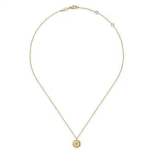 14K Yellow Gold Bujukan Medallion Pendant with .02cttw Starburst Diamond Center. This necklace is 14K yellow gold and diamonds are I/J color and eye-clean SI3 clarity, comes attached to a 17.5 inch chain. Designed by Gabriel & Co.