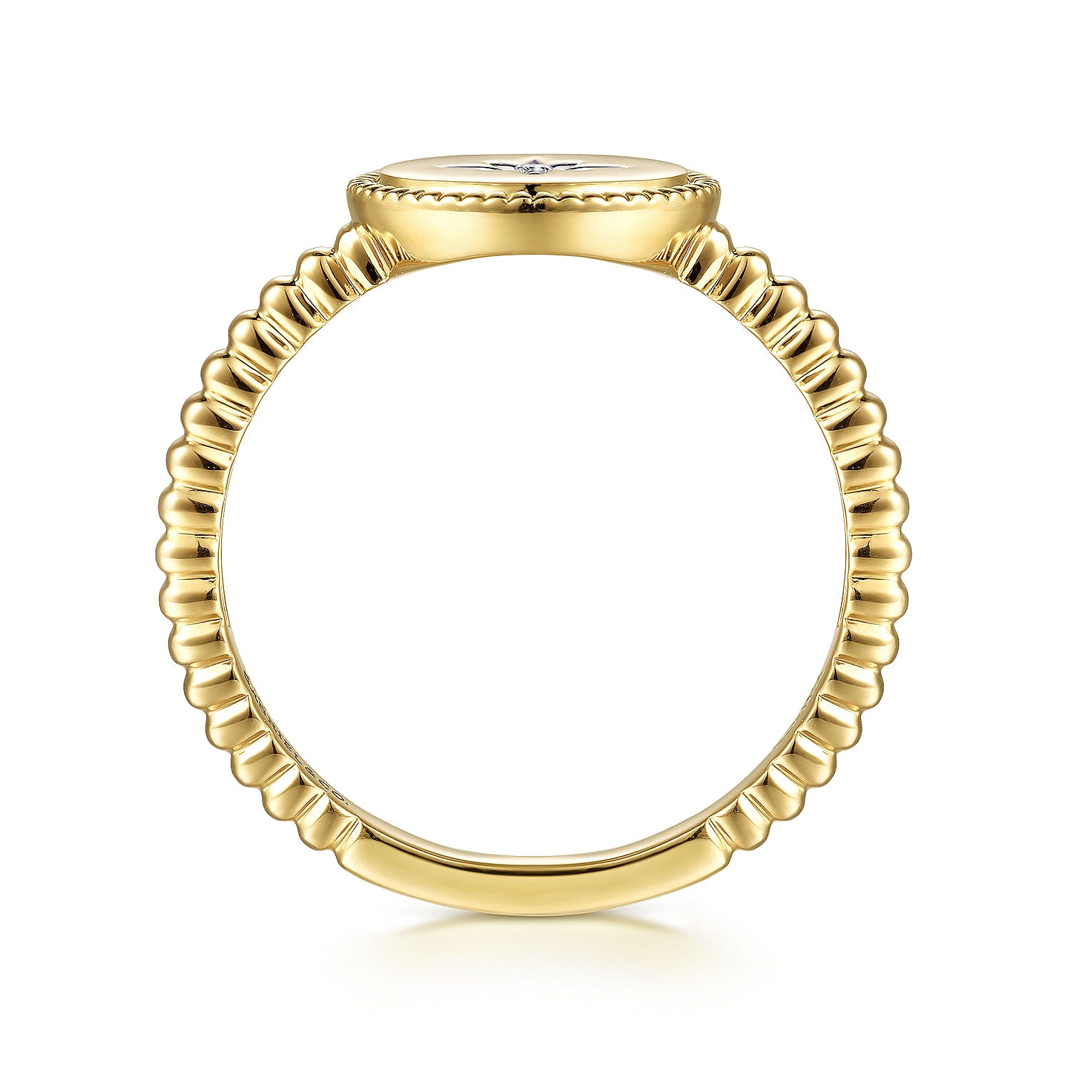 14K Yellow Gold Round 0.01cttw Diamond Star Bujukan Signet Ring. Features .01cttw of prong set round diamond with I color and SI clarity. Finger Size 6.5. Designed by Gabriel & Co.