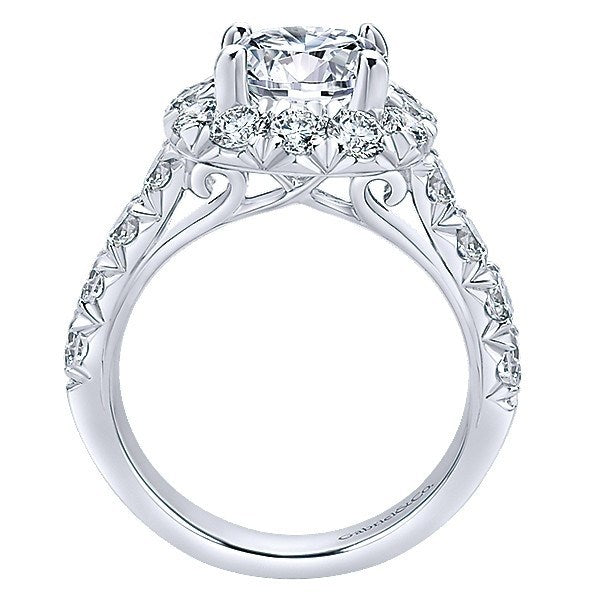 14K White Gold 1.74cttw French Pave Large Halo Diamond Engagement Ring. This ring features 1.74cttw of round diamonds with a substantial diamond shank of french pave set round diamonds. Designed to feature a stunningly large round halo design accenting a 2ct round center diamond. All diamonds are F/G in color and SI in clarity. Also available in yellow or rose gold, and platinum, either two-tone or single metal. Designed by Gabriel & Co. #325A