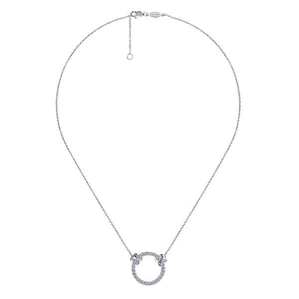 14K White Gold .12cttw Circle Diamond Necklace with Ornate Accents. This classic pave diamond circle necklace contains .12cttw of pave set round diamonds soldered to a chain with ornate accents. Comes with a 14k white gold 18 inch chain. This necklace is 14K white gold and diamonds are I/J color and eye-clean SI3 clarity. Designed by Gabriel & Co