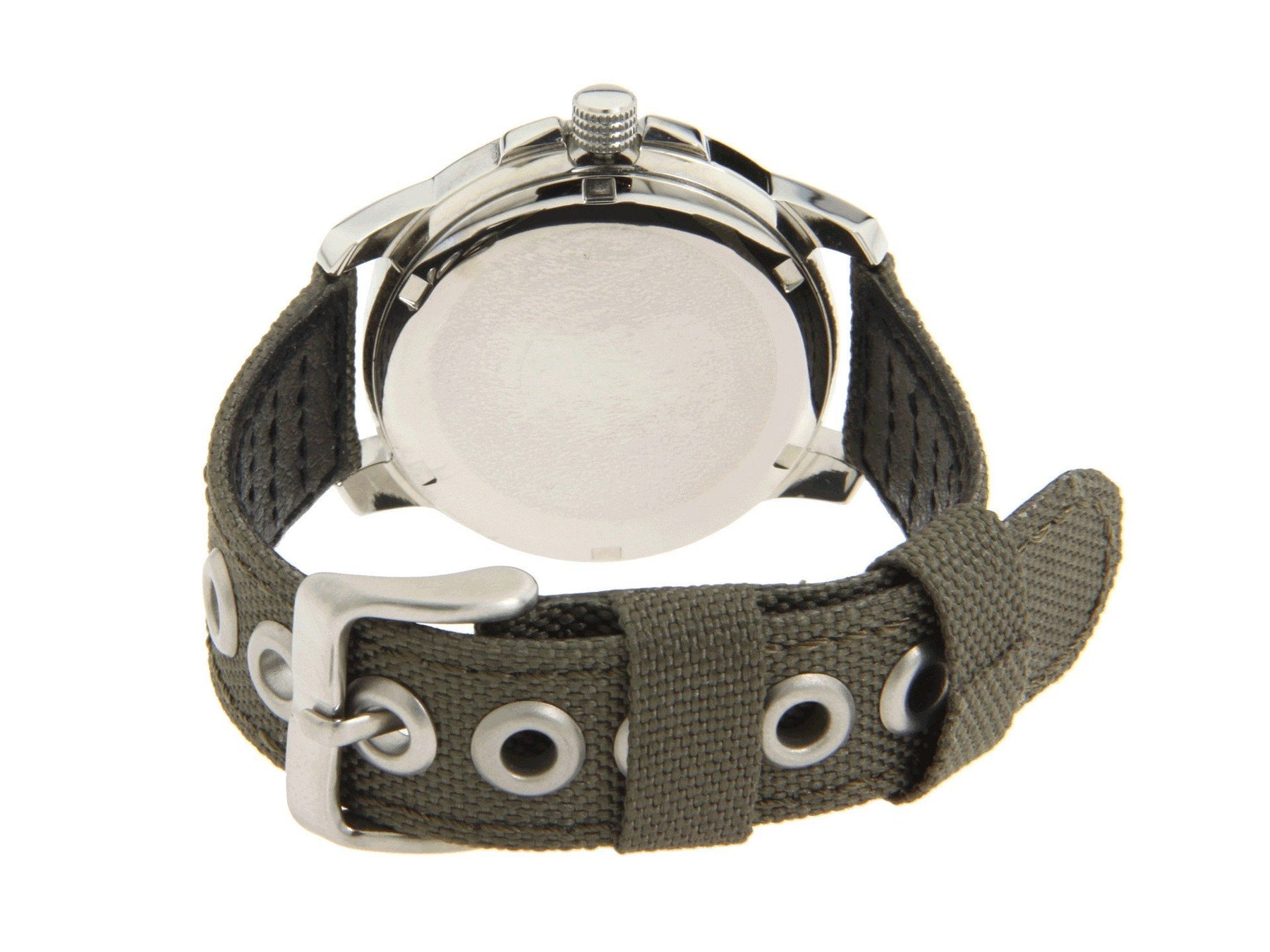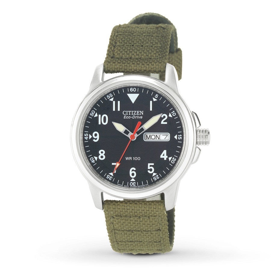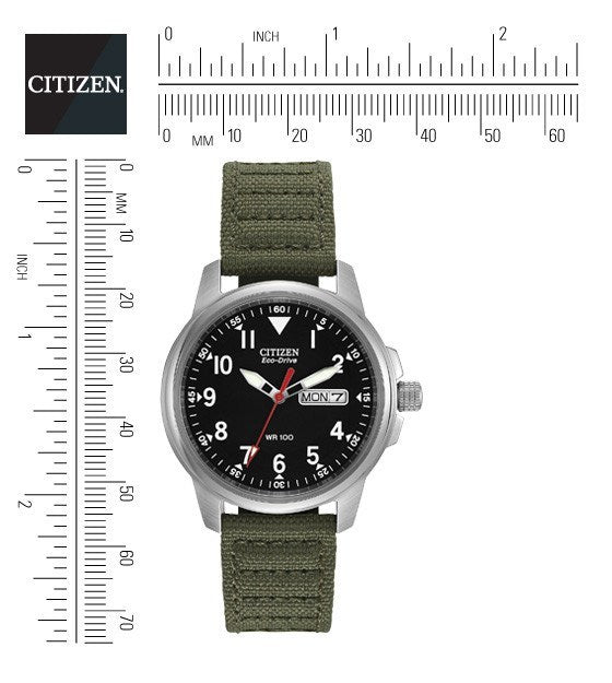 Citizen Eco-Drive Chandler watch. This Eco-Drive watch is powered by light, and features a 37mm screw back case. Black dial with Arabic numerals and woven green strap. The black dial provides a backdrop for simple Arabic numerals, housed in a stainless steel case along with a woven green strap with patterned stitching and a buckle clasp. Style number BM8180-03E
