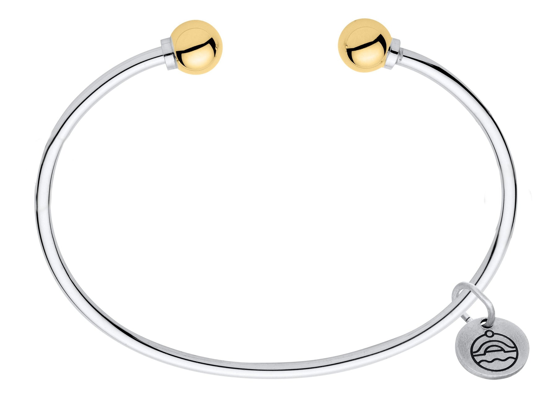 Sterling Silver and 14k Yellow Gold Cape Cod 7 Inch Cuff Bracelet. This open style cuff bracelet has two charming polished 14k yellow gold balls and a small Cape Cod charm adorned with a carving of the beach. Each piece is lovingly hand-crafted to ensure the quality of Cape Cod Jewelry. It is the perfect way to adorn yourself with the magic of the Cape every single day.