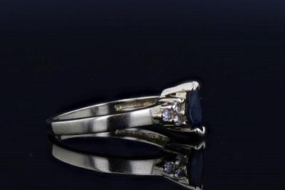 Estate 14K Yellow Gold Blue Sapphire Marquise & Diamond Ring. This pre-owned ring features  7x3.5mm marquise sapphire center stone, accented by 6 prong set .12cttw diamonds, 3 diamonds on each side. Finger Size 7.