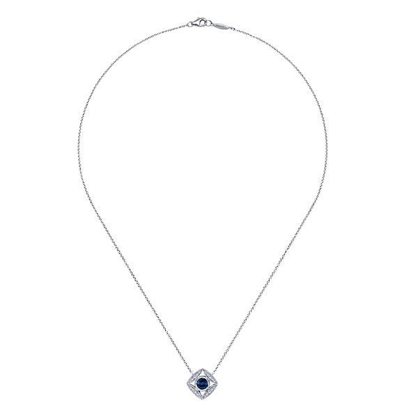 Sapphire and Diamond Cushion Shaped Starburst Design Necklace. This elegant cushion shaped necklace contains a round .66ct blue sapphire, surrounded by .14cttw of bead set accent diamonds with a startburst design of negative space. Comes with a 14k white gold 18 inch chain. This necklace is 14K white gold and diamonds are I/J color and eye-clean SI3 clarity. Designed by Gabriel & Co., also available in yellow gold and rose gold.