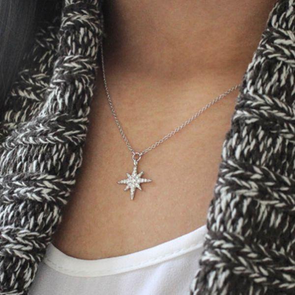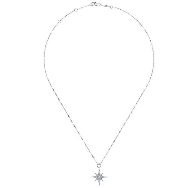 14K White Gold Starburst Diamond Fashion Necklace. This stylish new diamond fashion necklace contains .25cttw of round diamonds in a starburst design. Comes with a 14k white gold 18 inch chain. This necklace is 14K white gold and diamonds are I/J color and eye-clean SI3 clarity. Designed by Gabriel & Co., also available in yellow gold and rose gold.