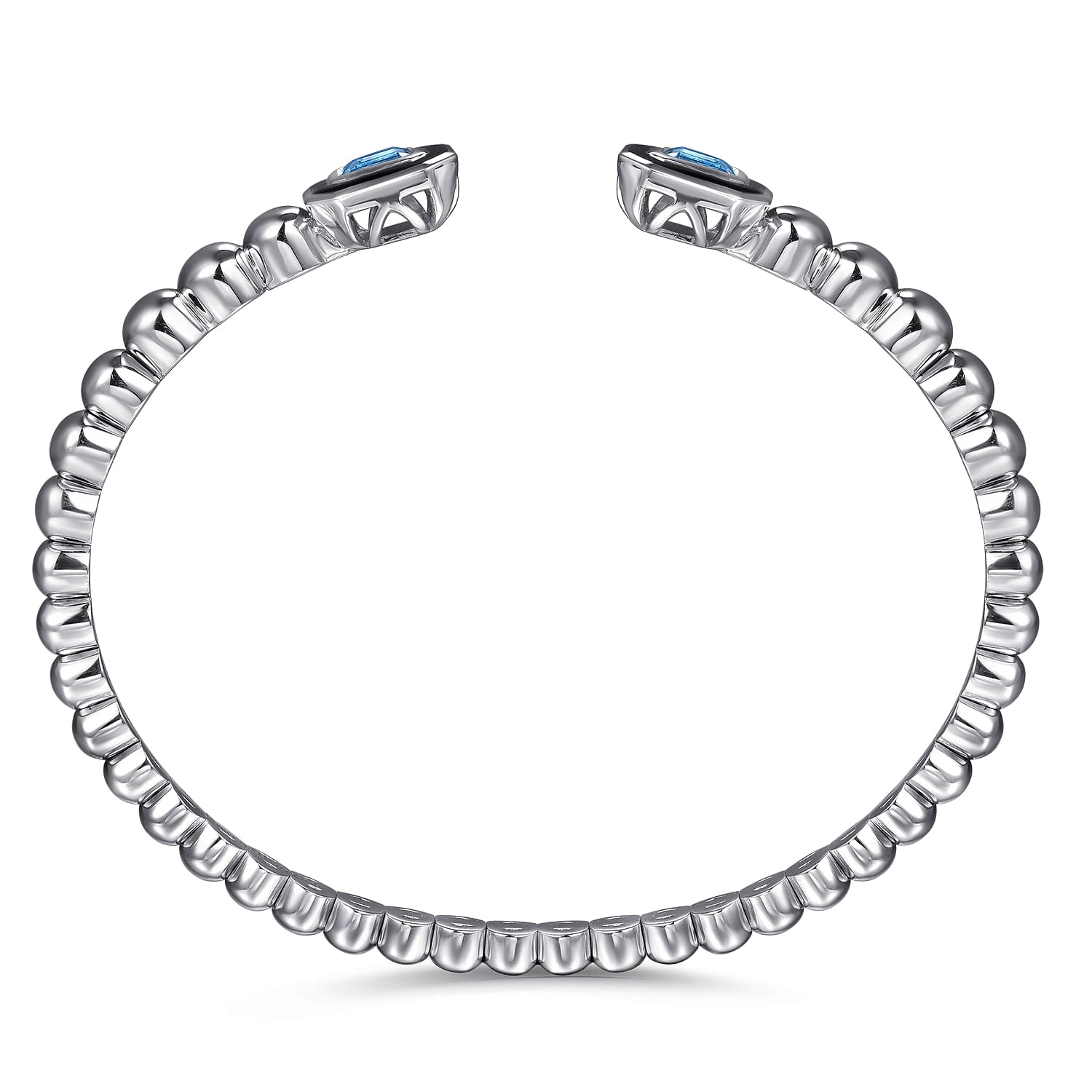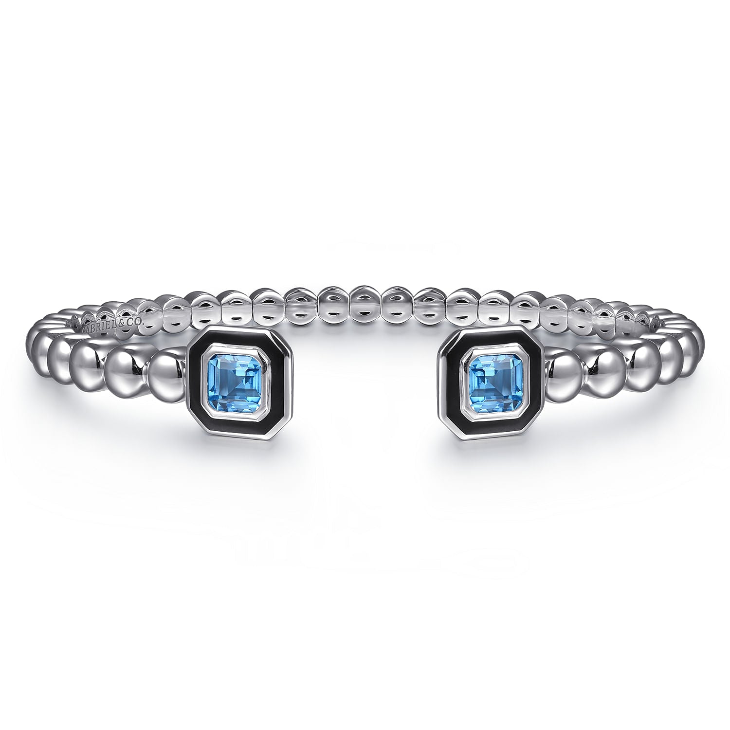 Sterling Silver 6.25" Bujukan Blue Topaz Open Bangle Bracelet with black enamel. This sterling silver bangle style bracelet is 6.25 inches and features two blue topaz bezel set totaling 1.46cttw. Designed by Gabriel & Co.