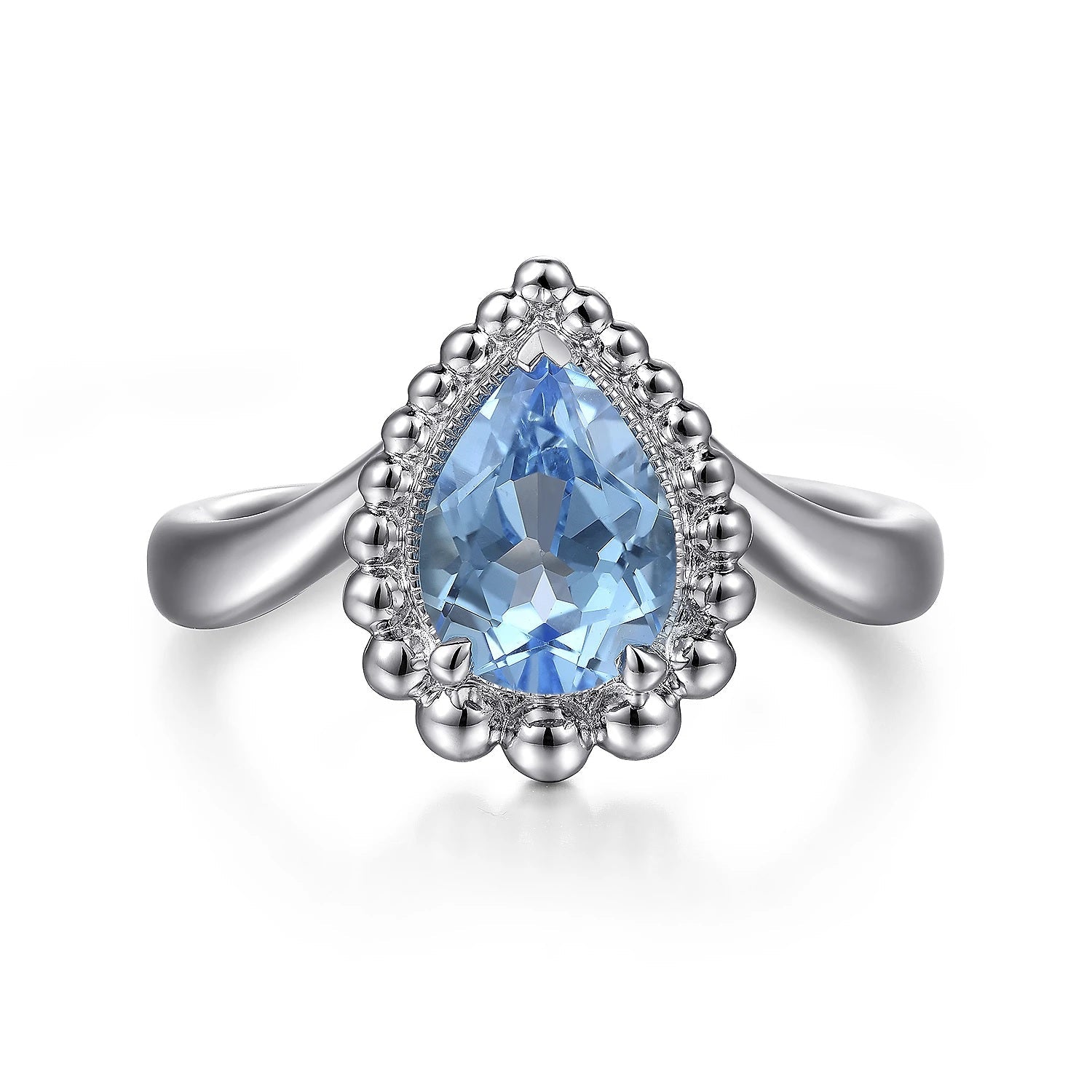 Sterling Silver Bujukan Swiss Blue Topaz Chevron Ring. Features a pear shaped 8x6mm swiss blue topaz with a bujukan style halo. Finger Size 6.5. Designed by Gabriel & Co.