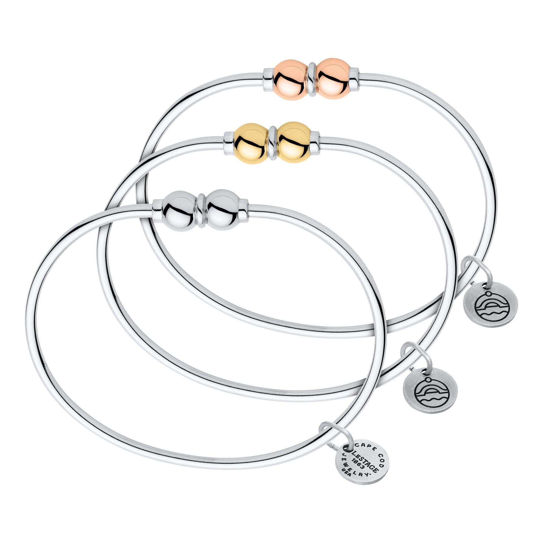 All Cape Cod bracelets are made with solid sterling silver and solid 14k gold. Bracelets are never gold plated. Available in all Sterling Silver, Sterling Silver with two 14K Yellow Gold Balls, or Sterling Silver with two 14K Rose Gold Balls. Prices will vary.