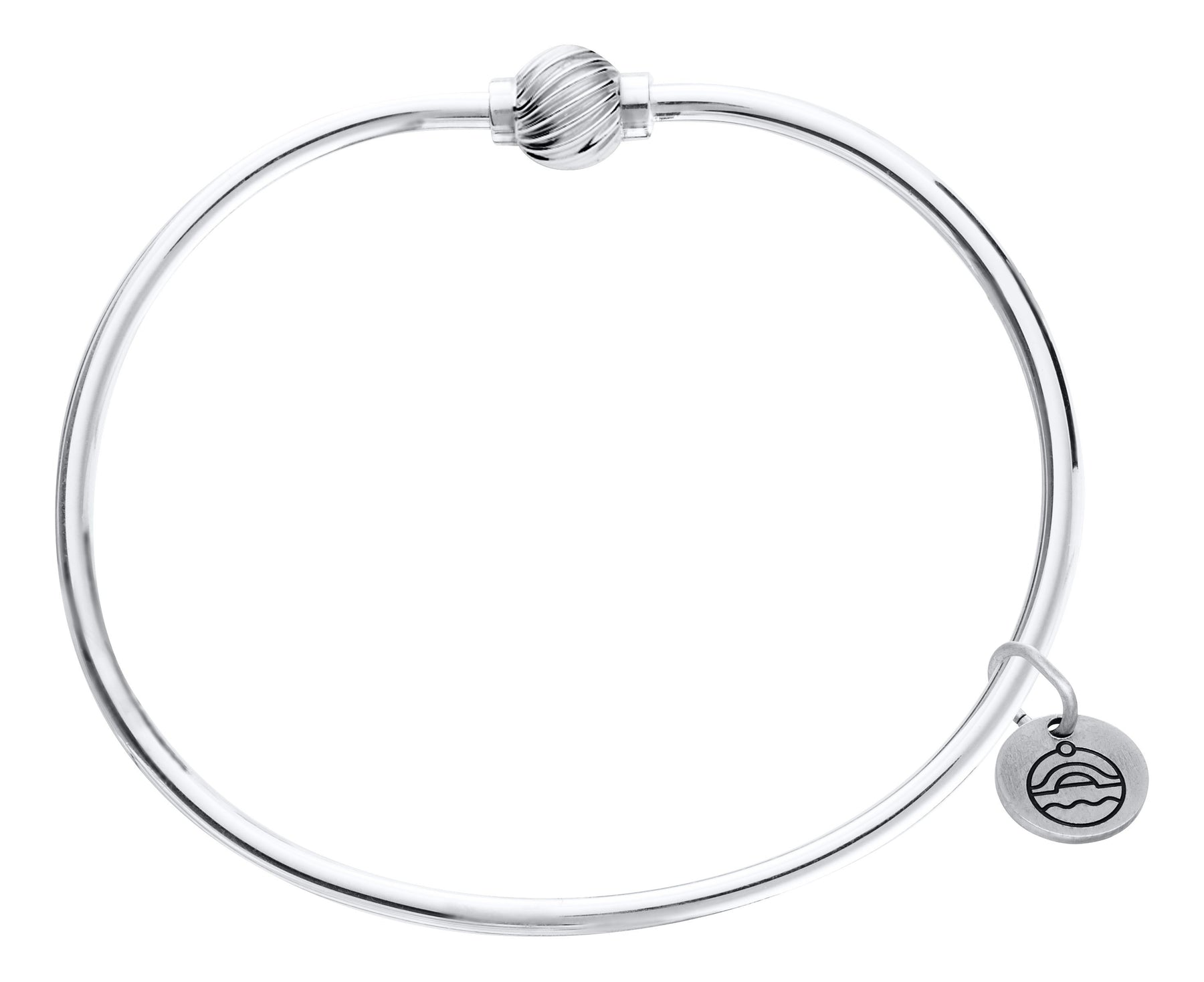 Sterling Silver Cape Cod 7 Inch Swirl Bead Bracelet. This bangle bracelet has one charming twisted sterling silver ball and a small Cape Cod charm adorned with a carving of the beach. Each piece is lovingly hand-crafted to ensure the quality of Cape Cod Jewelry. It is the perfect way to adorn yourself with the magic of the Cape every single day.